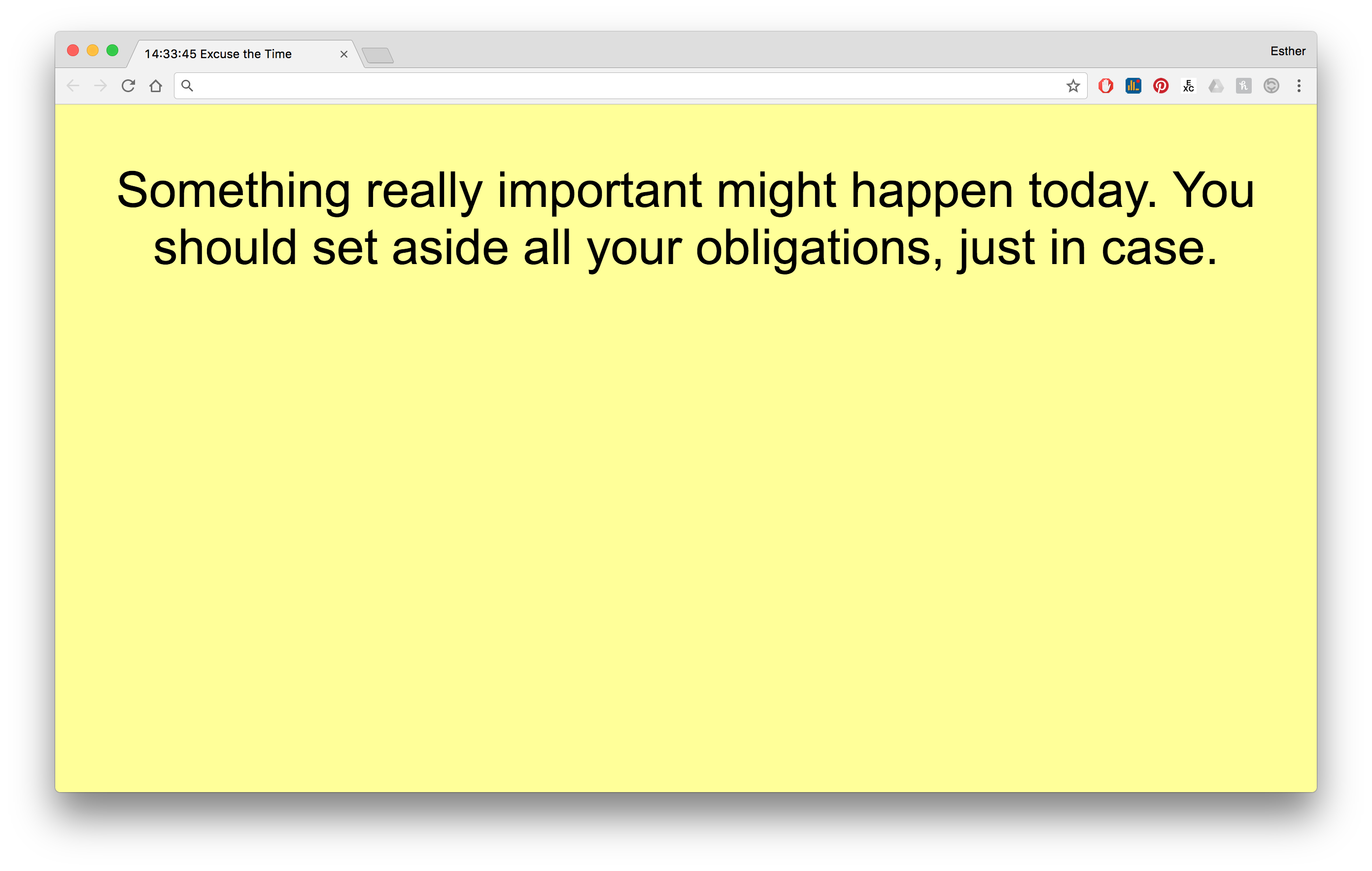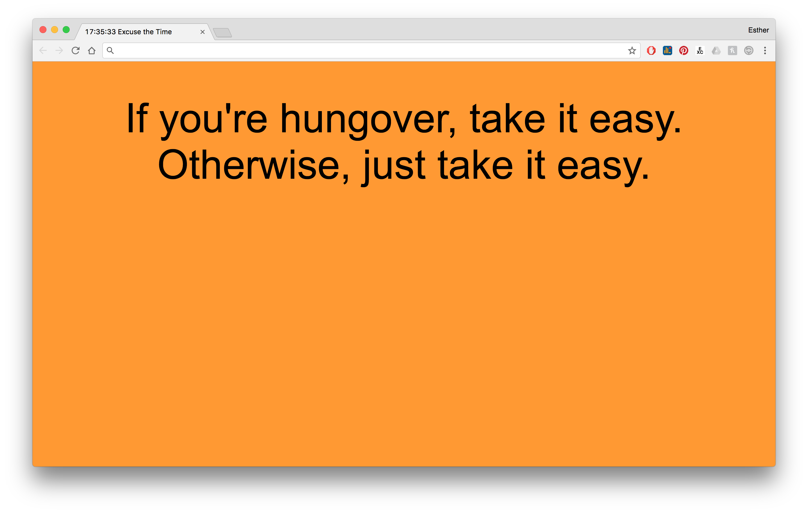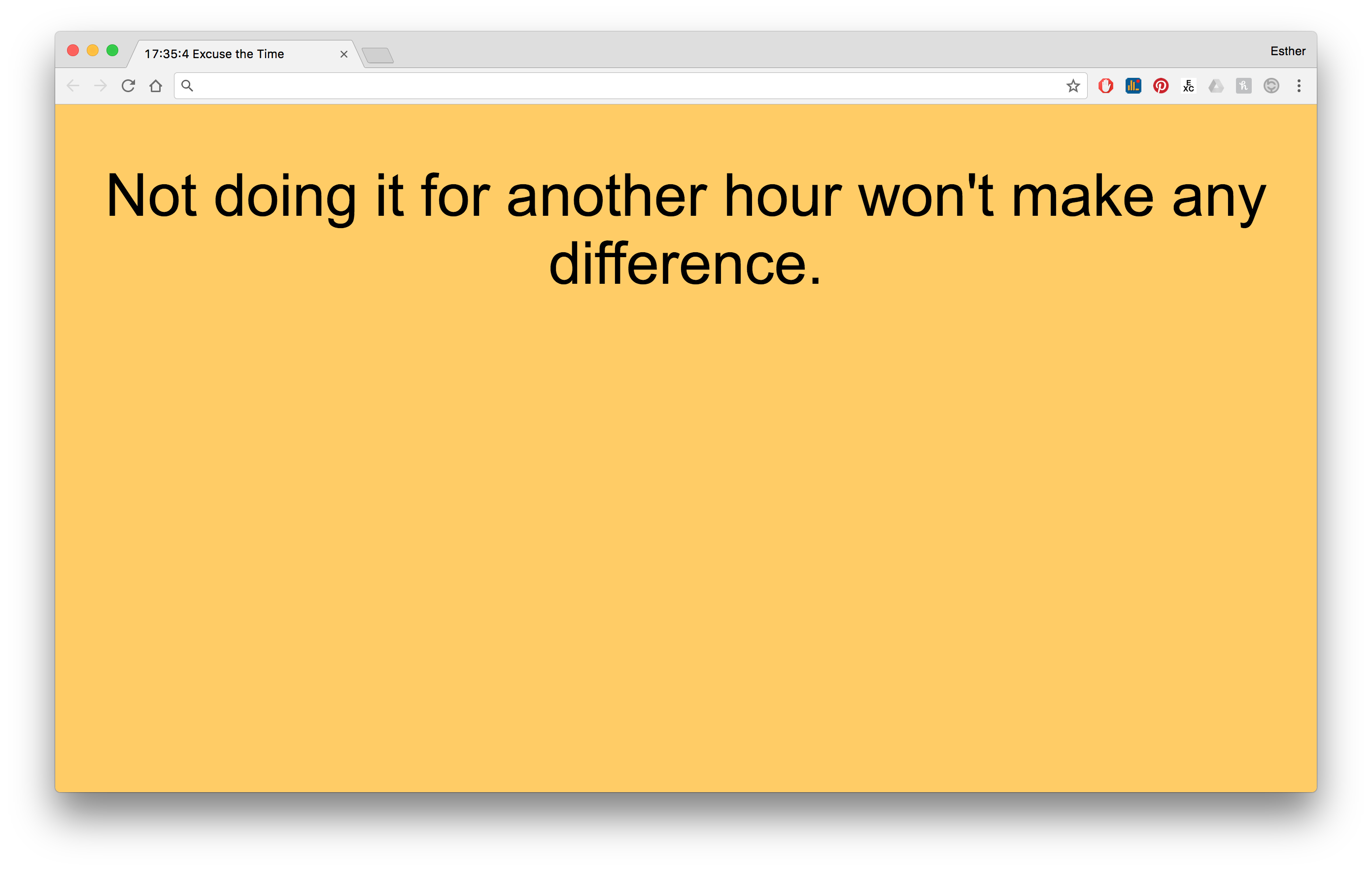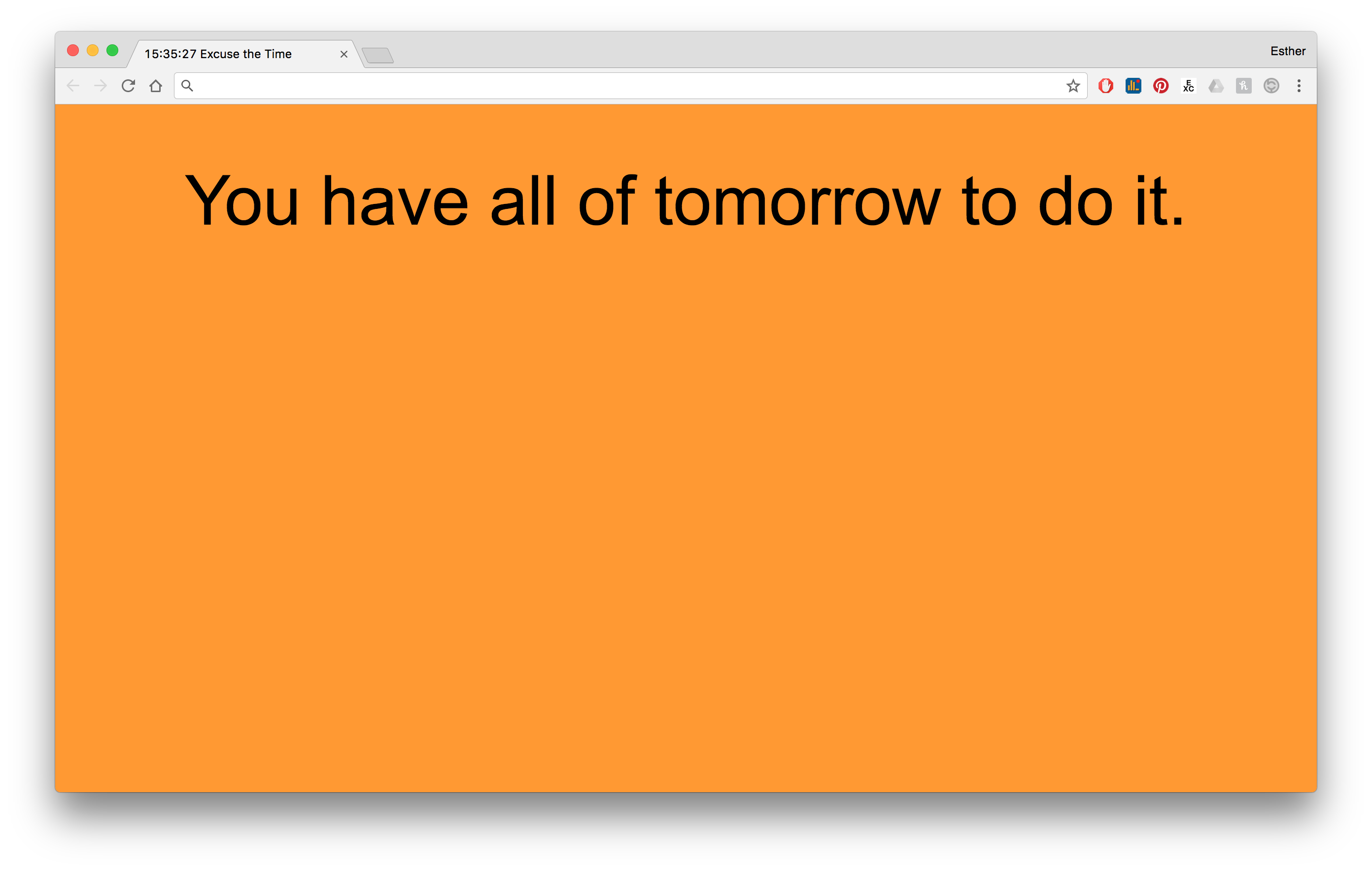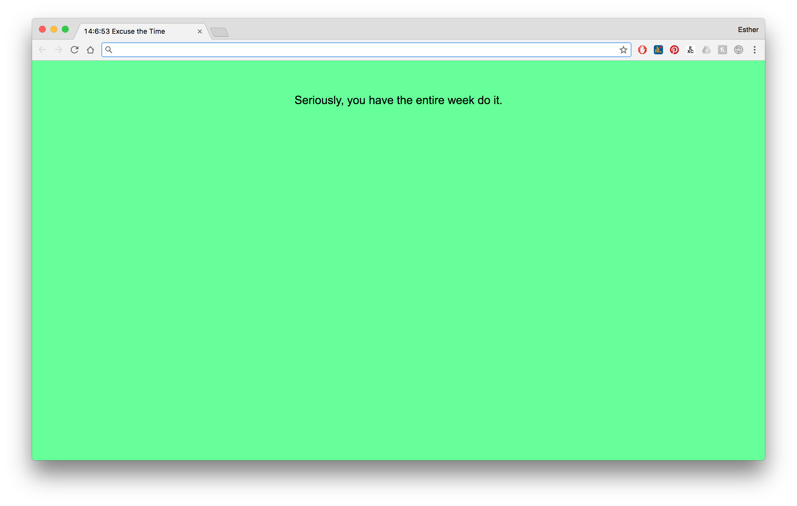 Changes by day: Every day, the background color of the webpage changes, as well as the size of the typeface that displays the excuses. This is meant to convey a creeping sense of urgency to meet a deadline; on Mondays, the text is smallest and the background color is green, to evoke a feeling of having the whole week to get something done. As the week progresses, the background color gradually changes towards red and the text gets bigger, as a subconscious reminder that you're not doing the things you need to get done.