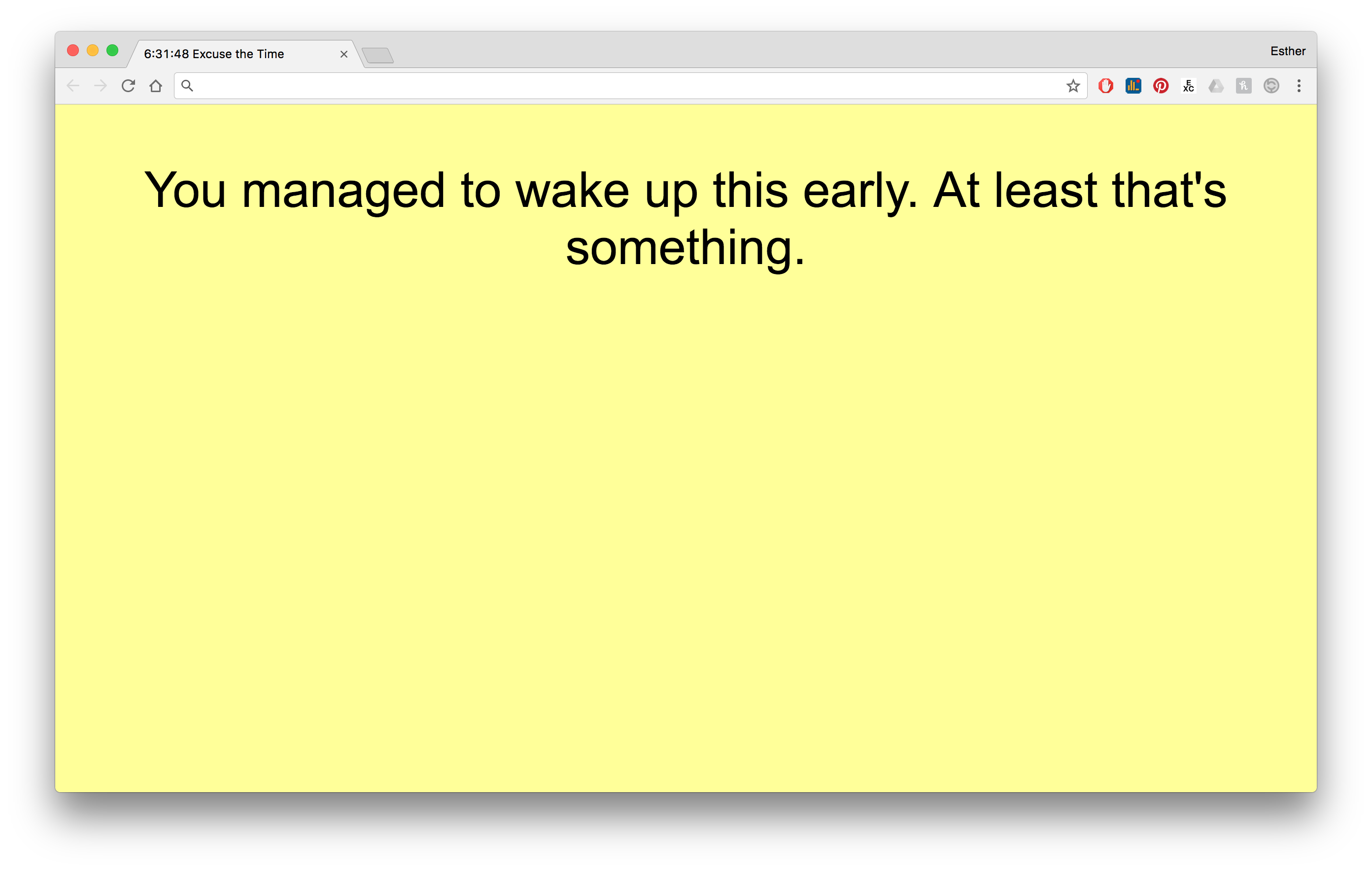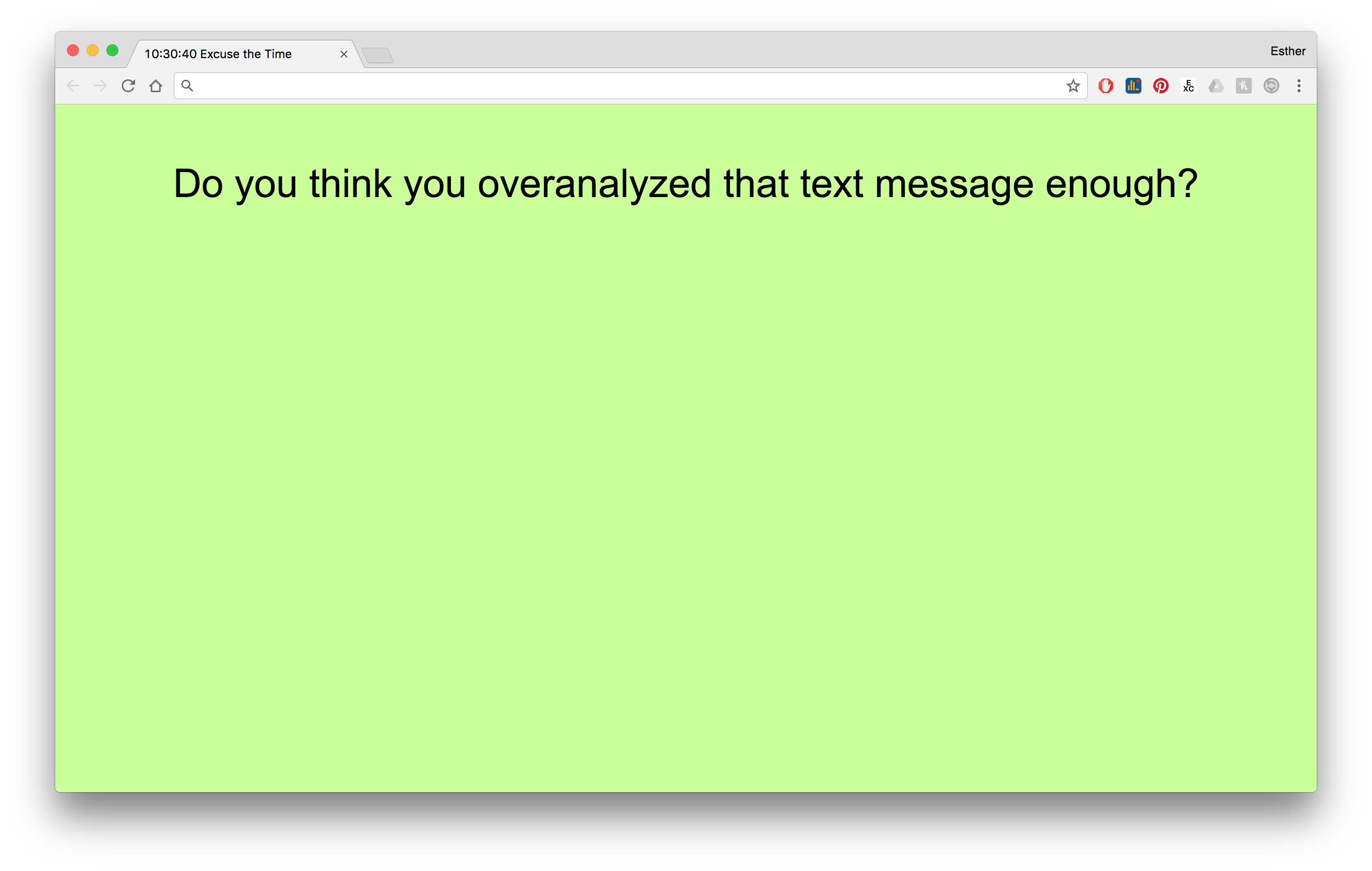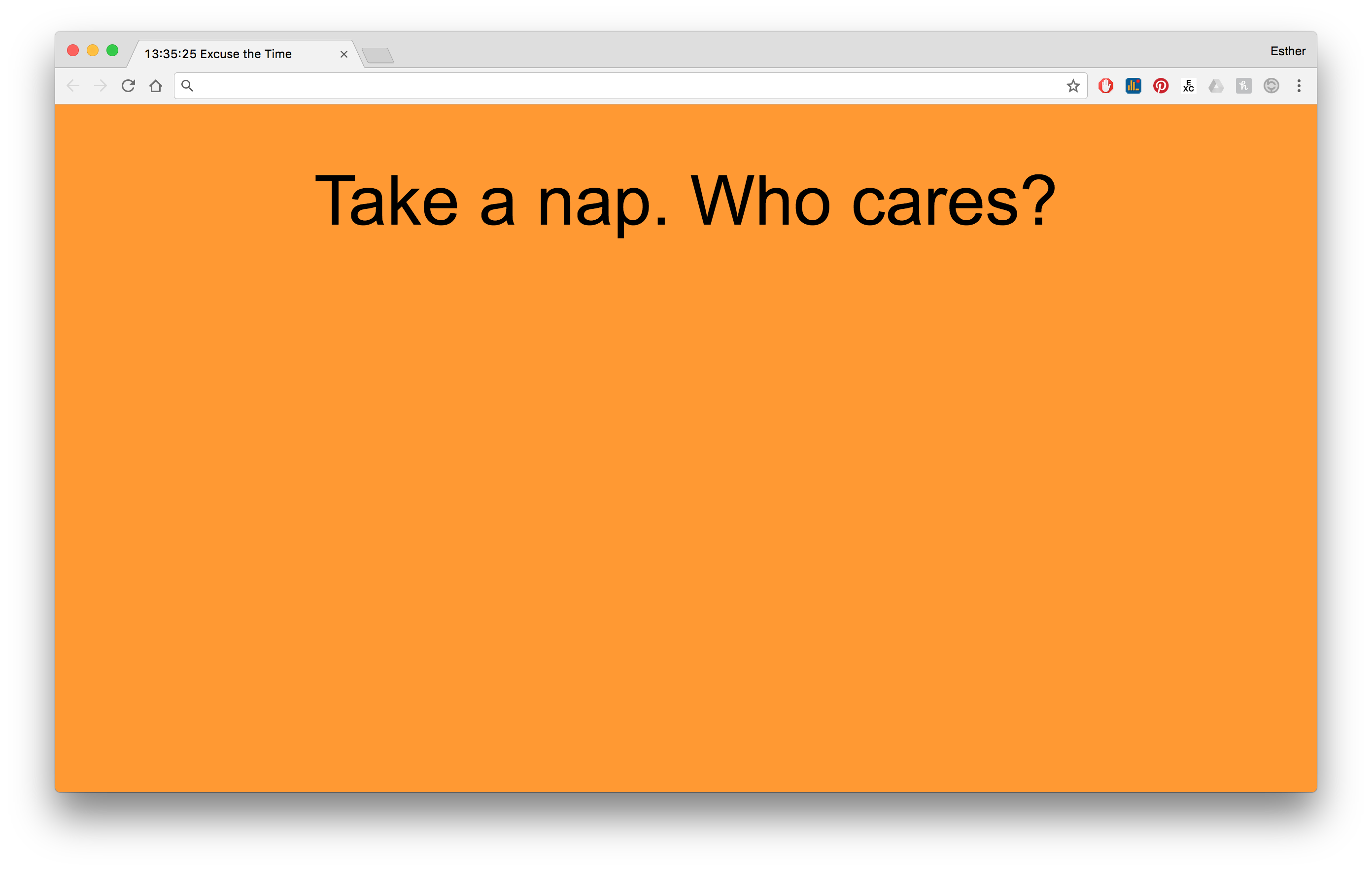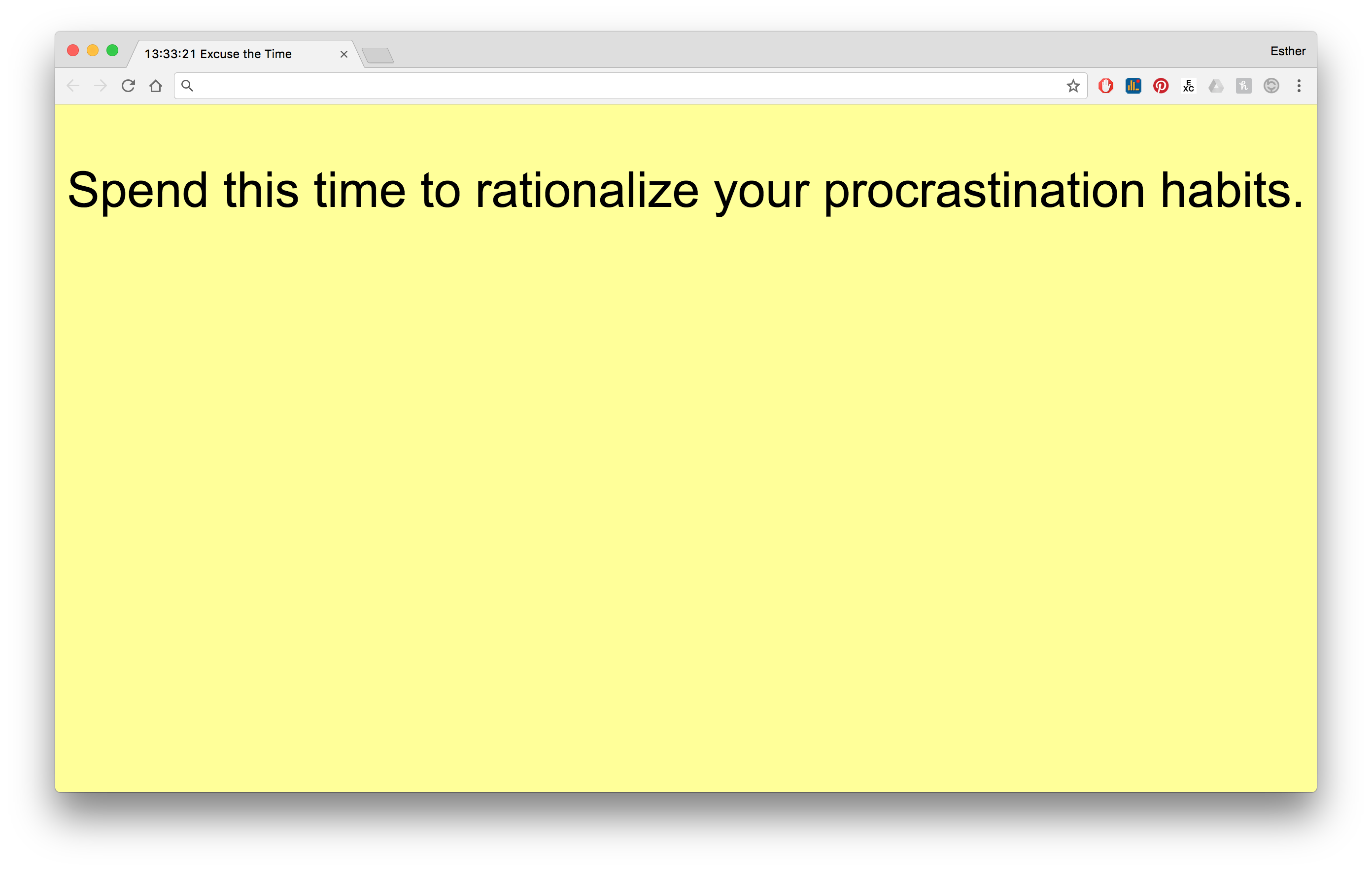 Changes by day: Every day, the background color of the webpage changes, as well as the size of the typeface that displays the excuses. This is meant to convey a creeping sense of urgency to meet a deadline; on Mondays, the text is smallest and the background color is green, to evoke a feeling of having the whole week to get something done. As the week progresses, the background color gradually changes towards red and the text gets bigger, as a subconscious reminder that you're not doing the things you need to get done.