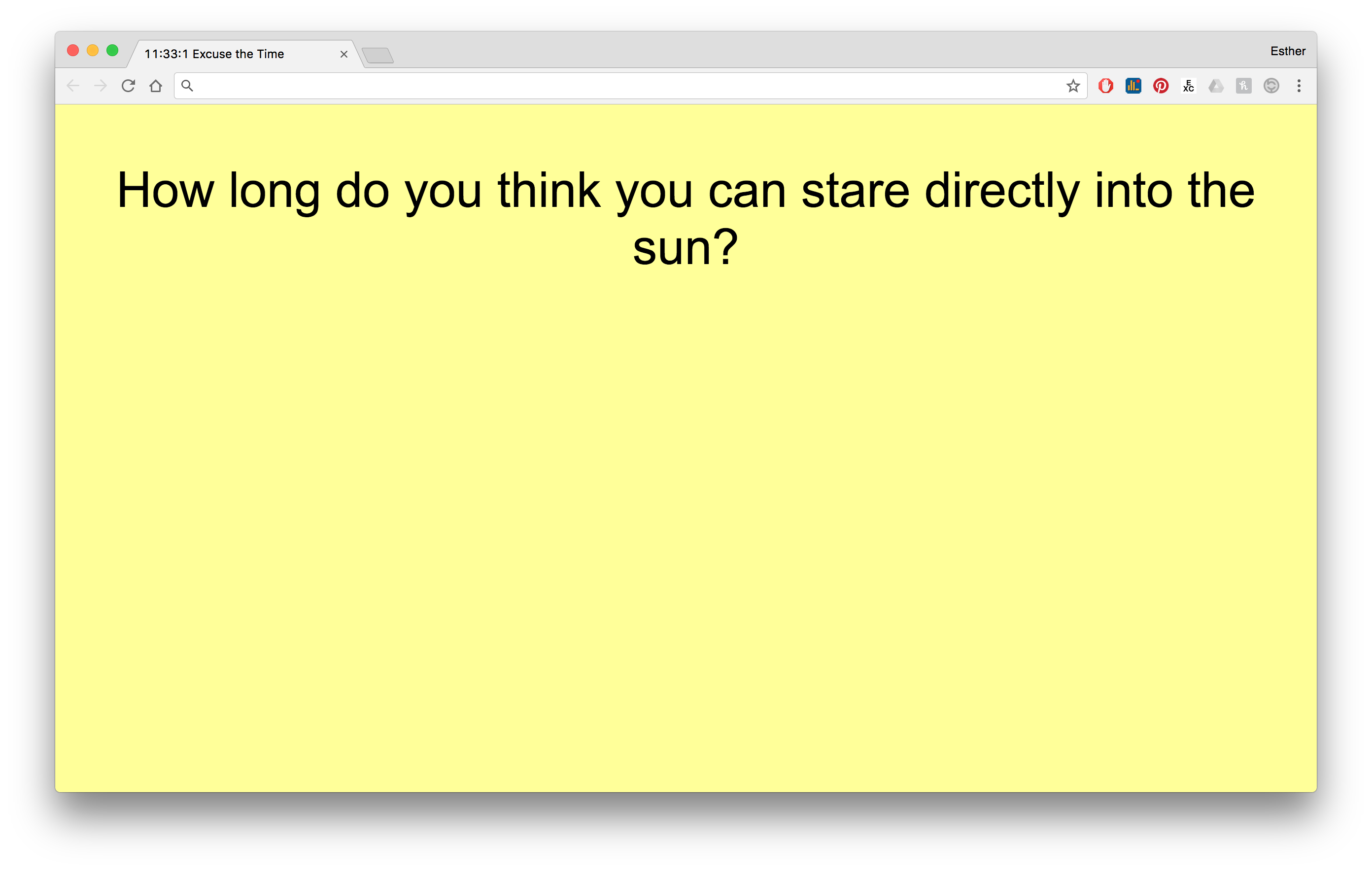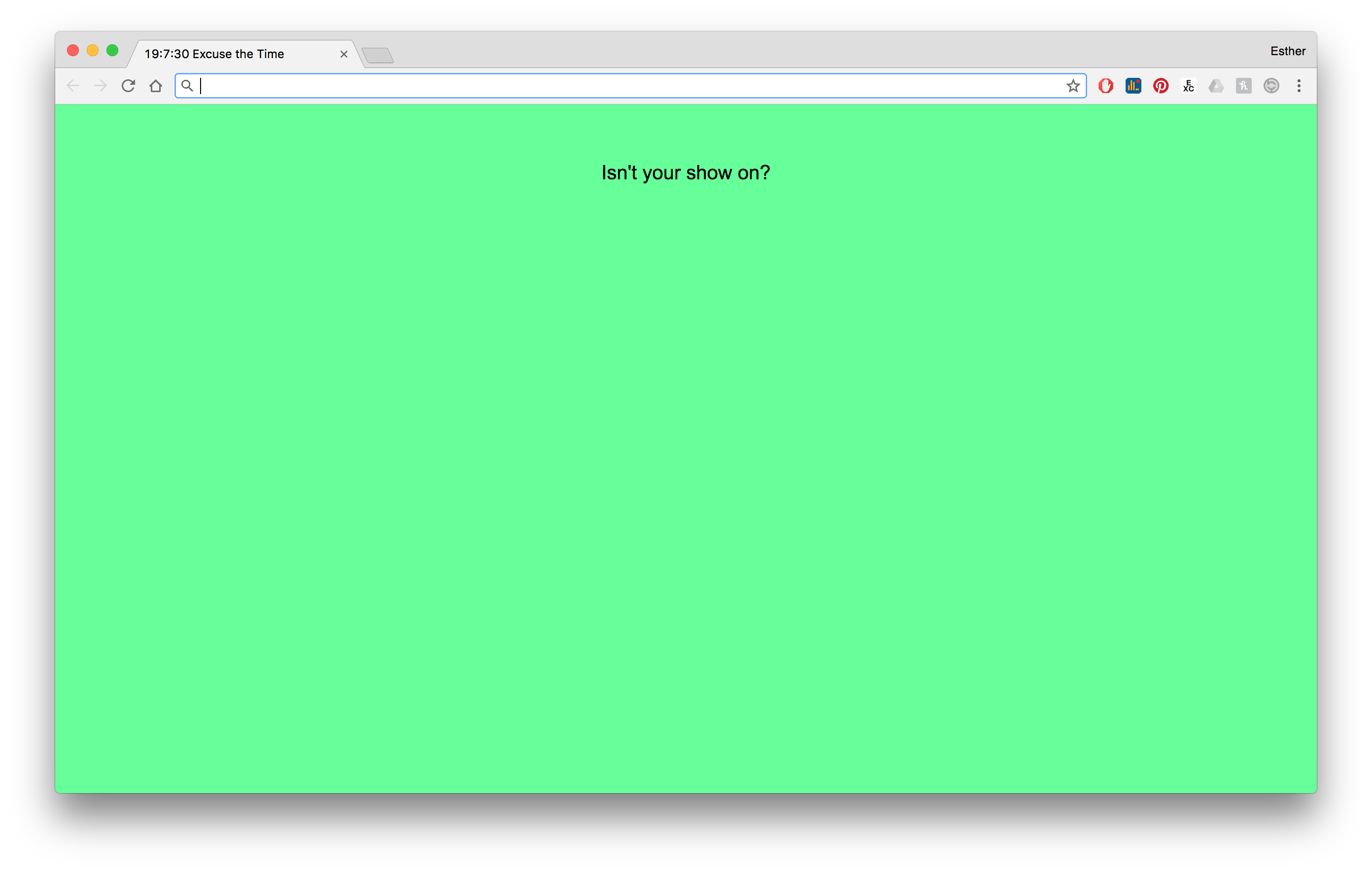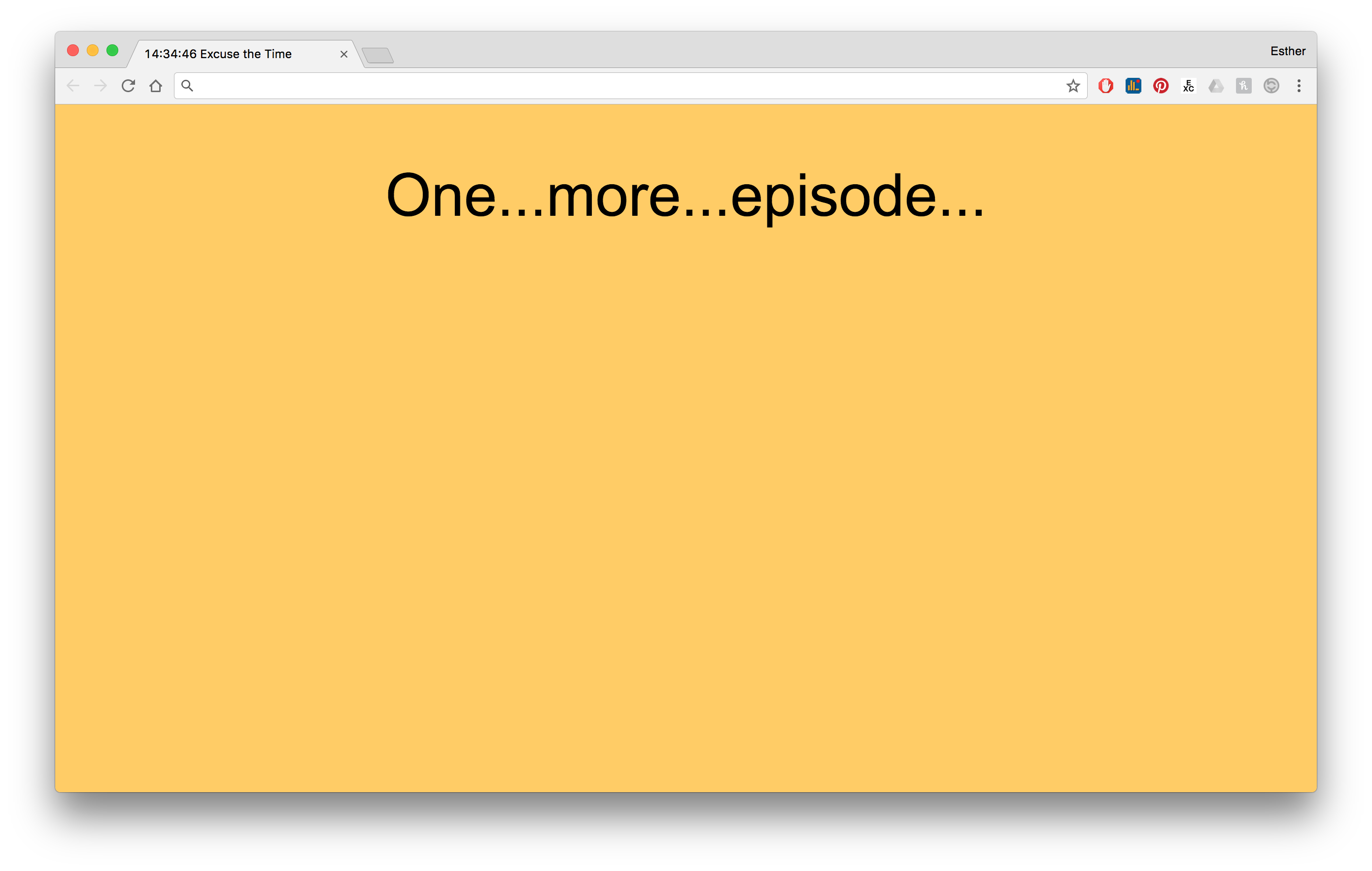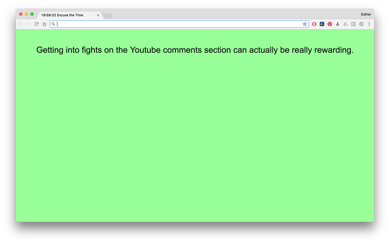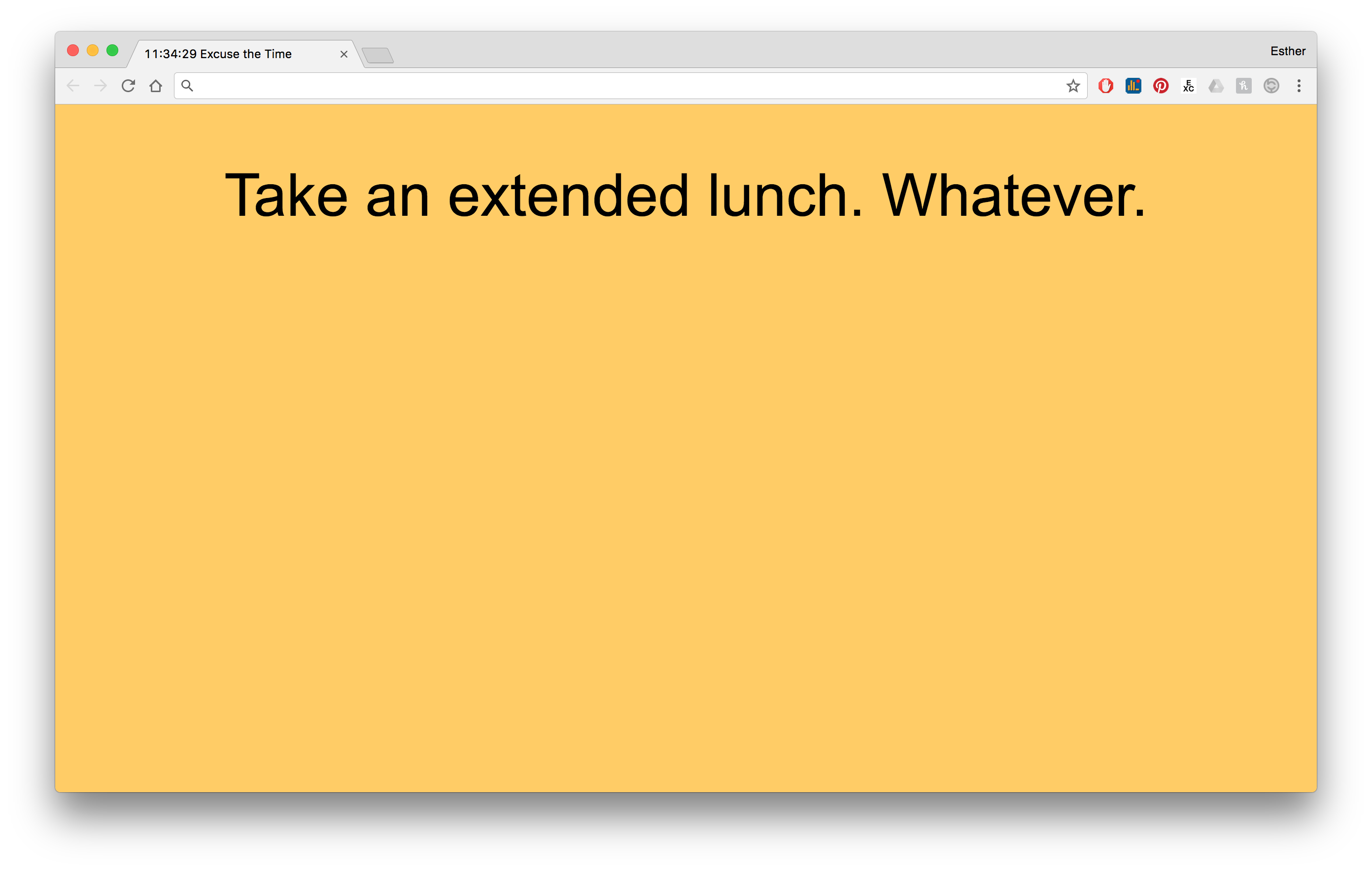 Changes by day: Every day, the background color of the webpage changes, as well as the size of the typeface that displays the excuses. This is meant to convey a creeping sense of urgency to meet a deadline; on Mondays, the text is smallest and the background color is green, to evoke a feeling of having the whole week to get something done. As the week progresses, the background color gradually changes towards red and the text gets bigger, as a subconscious reminder that you're not doing the things you need to get done.