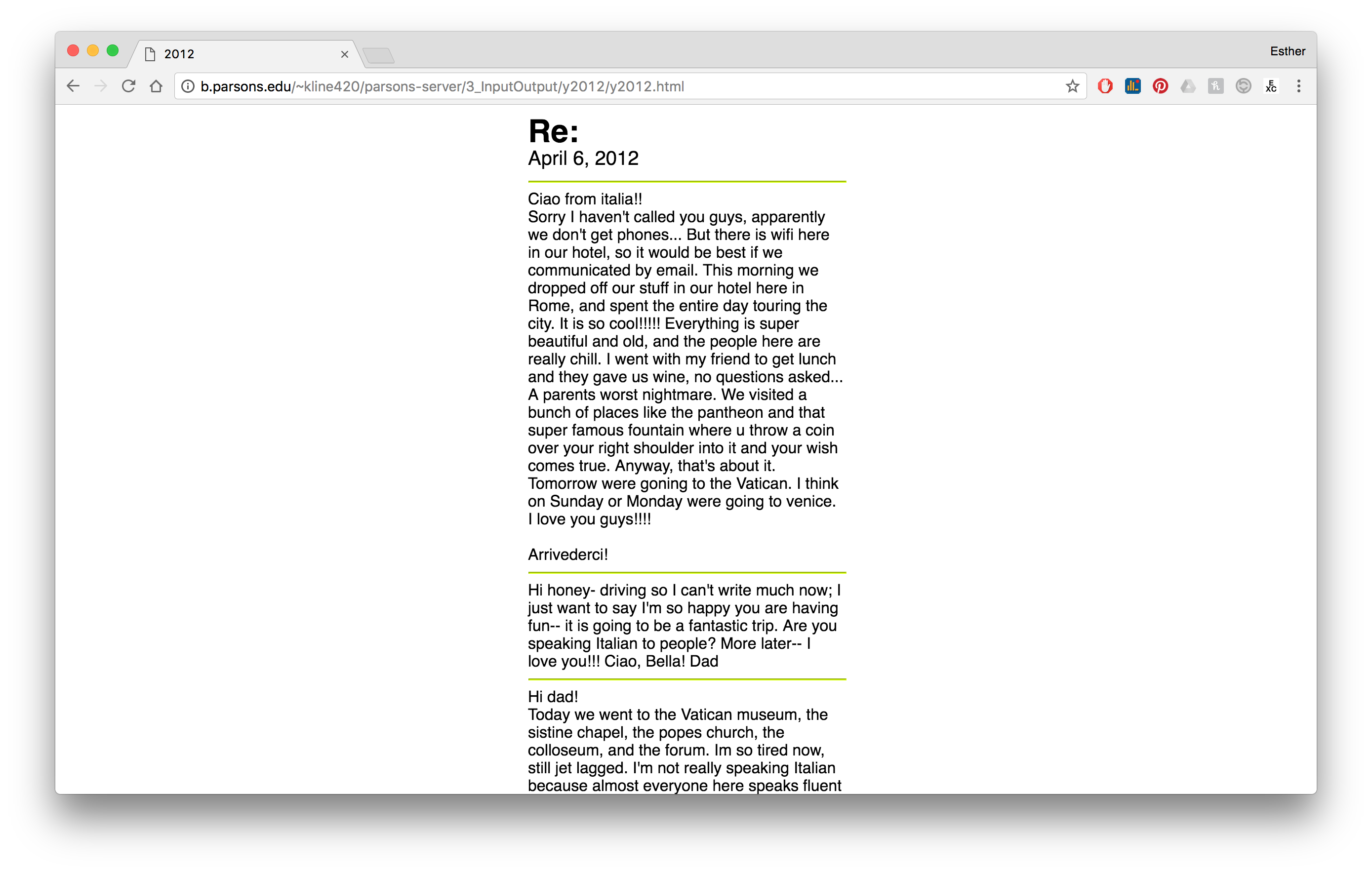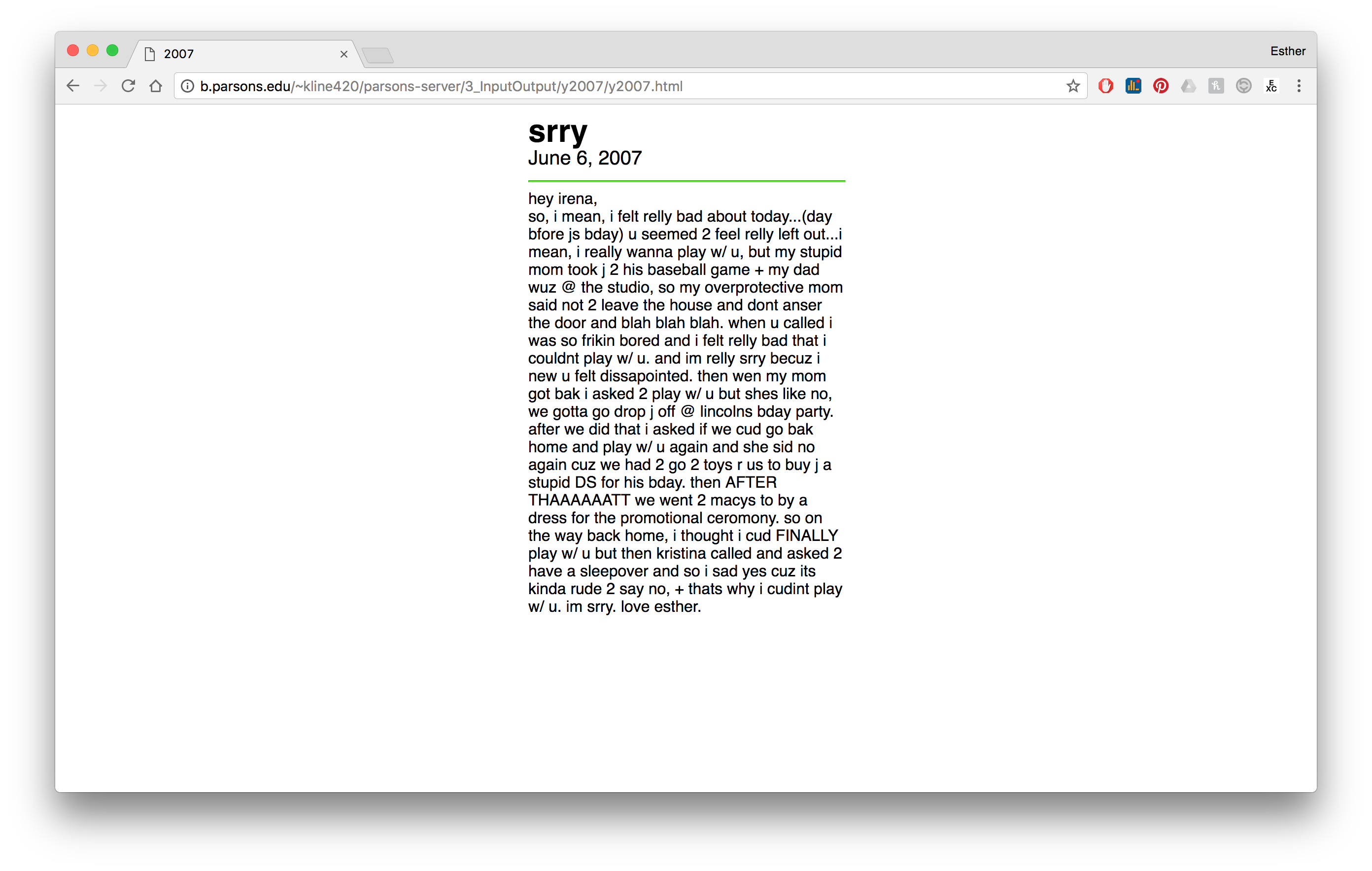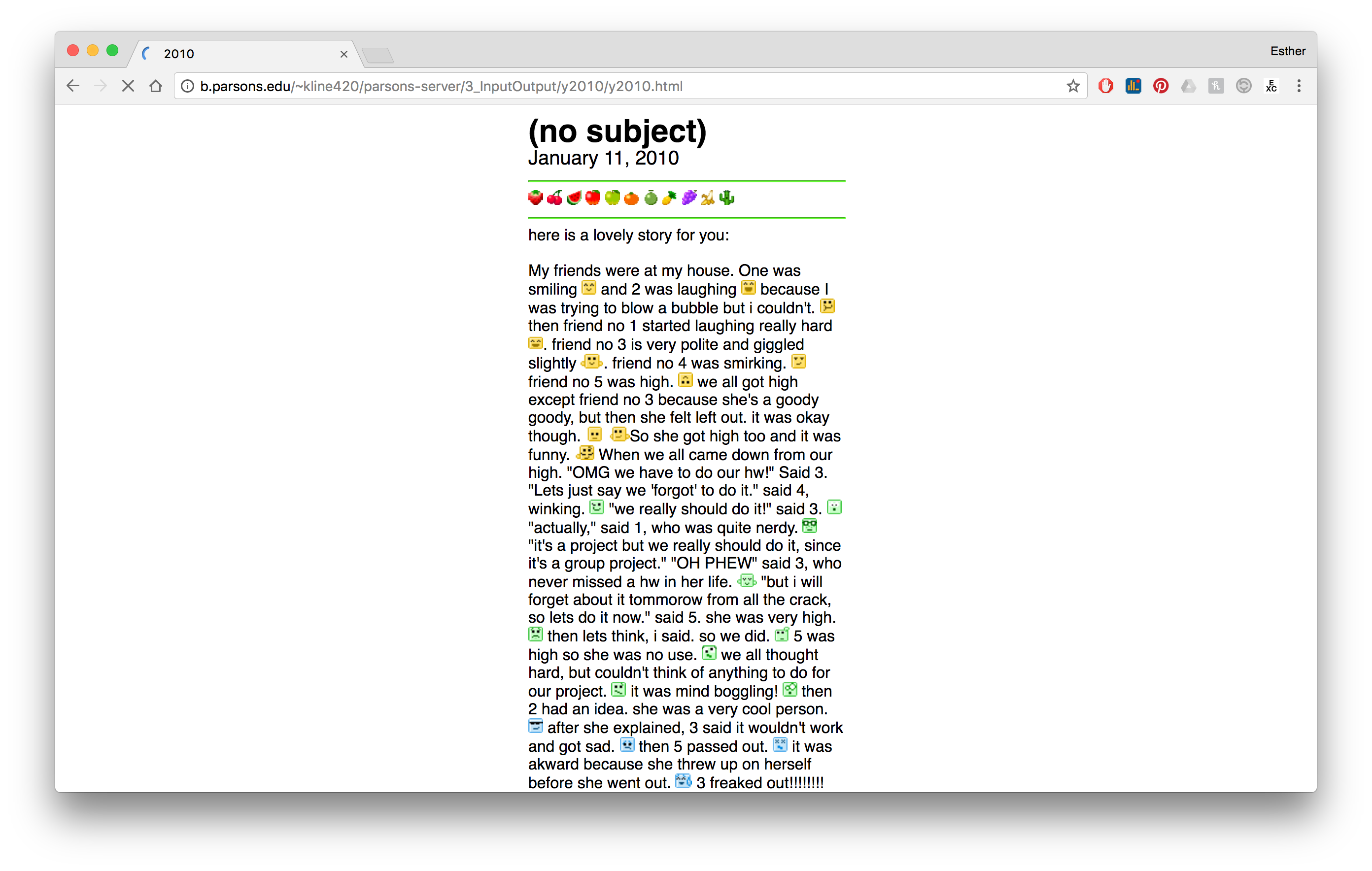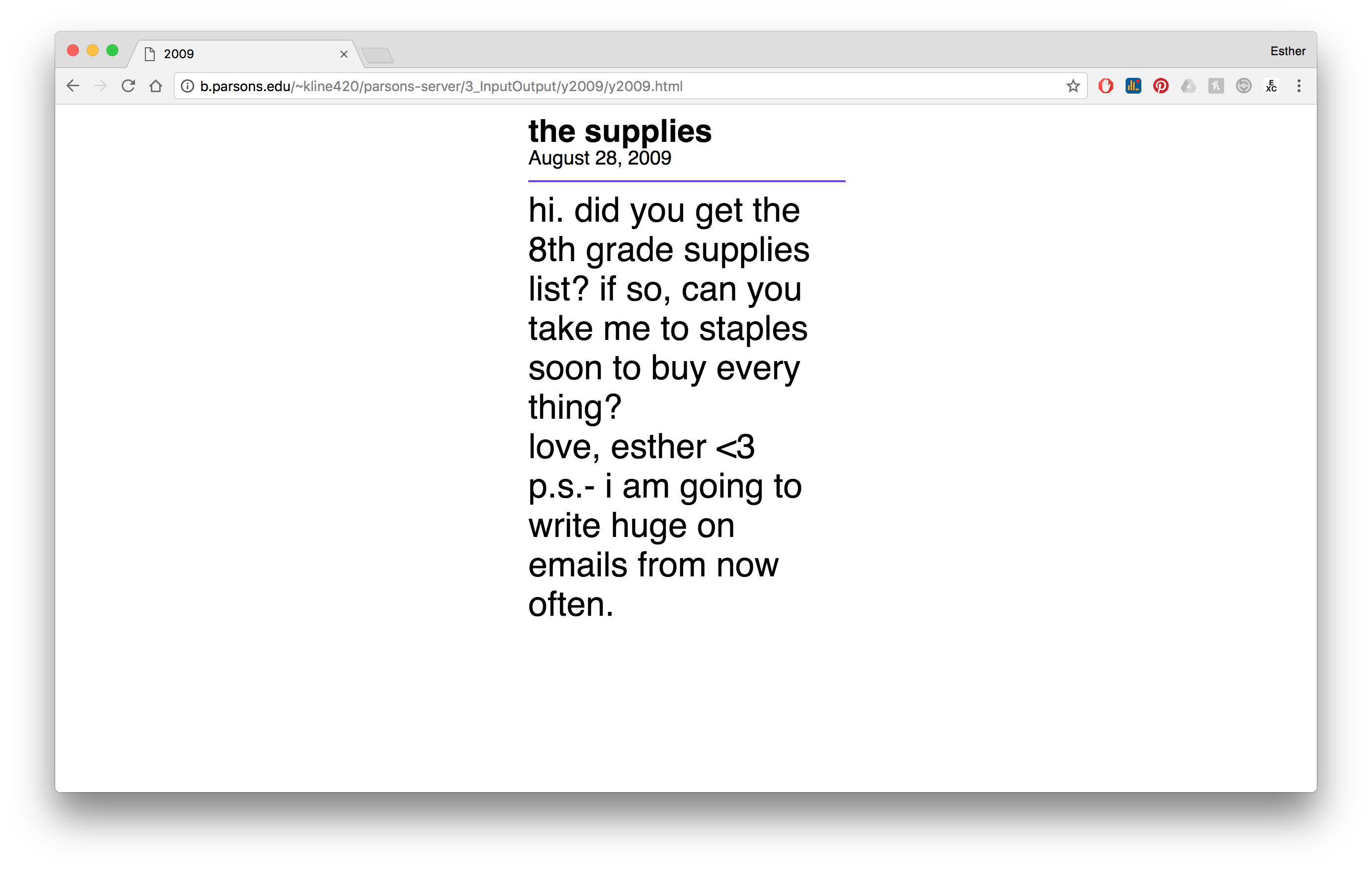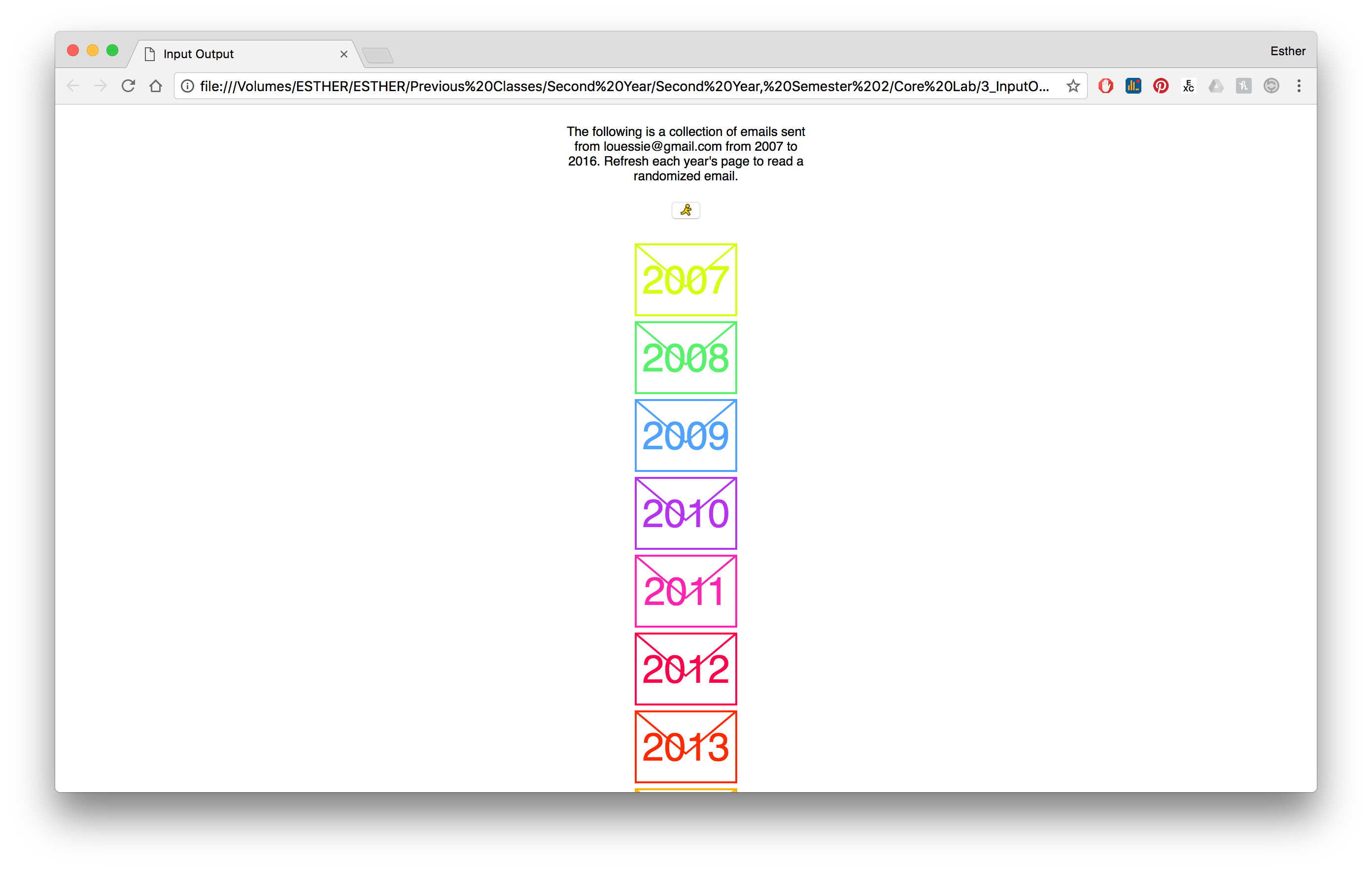 Each year contains three emails I sent that load randomly (when you refresh the page, another randomly chosen email appears).