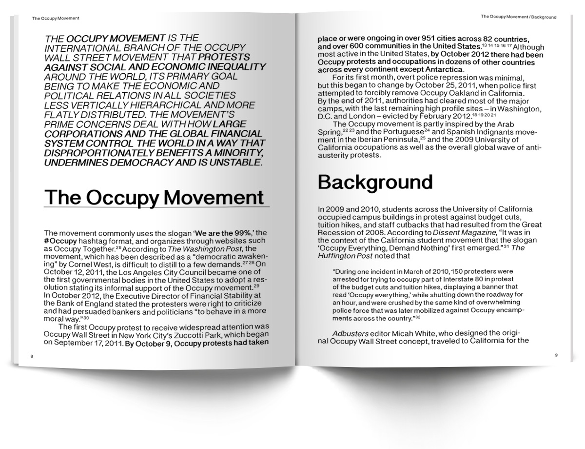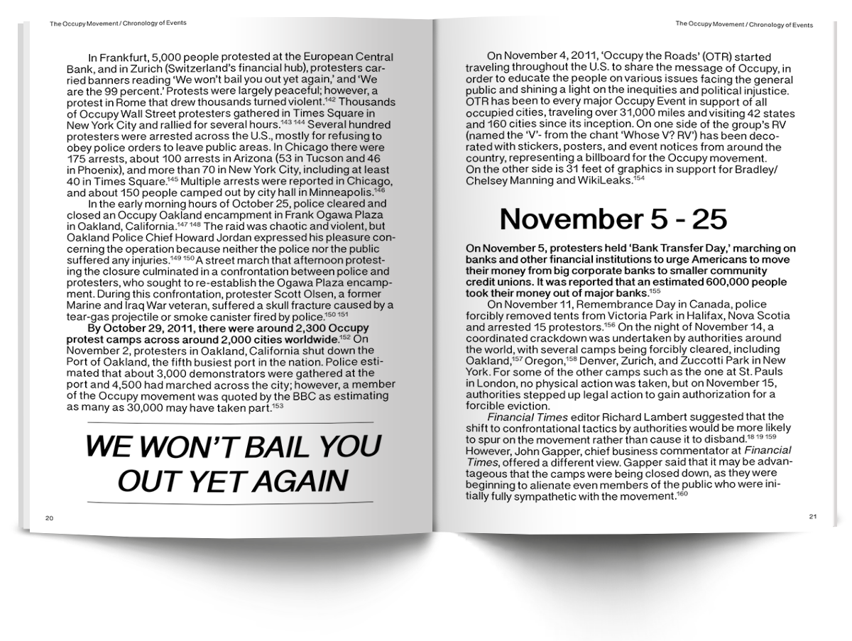 Emulating free printed material (such as manifestos, and event flyers) utilized by this movement, I wanted to give readers a complete picture of the Occupy Movement; as many people in New York City only know the movement as Occupy Wall Street. What many don't know is that this is one of the largest global movements in human history.
